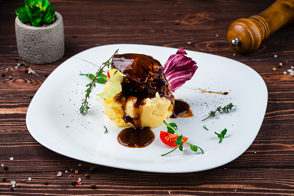Стейк из говядины с перечным соусом Categories: Горячие блюда Говядина вырезка, картофельное пюре, соус перечный, томат черри. 45.50 руб.
