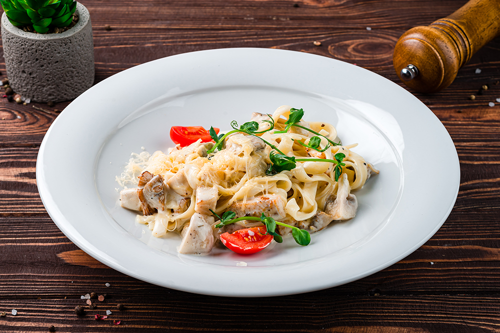 Фетучини с курицей и грибами Categories: Паста Макароны фетучини, филе куриное, шампиньоны свежие, сливки, сыр пармезан. 21.30 руб.